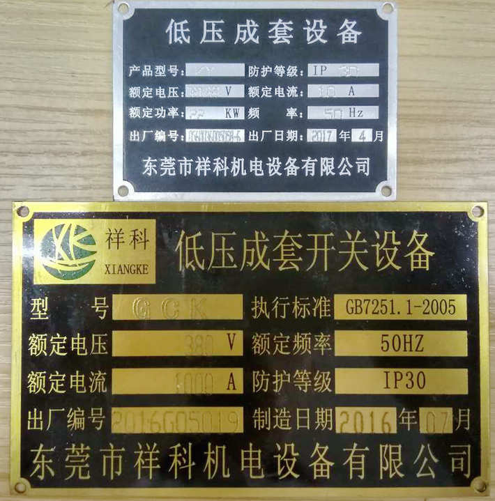 開關(guān)柜銘牌可一目了然地讓操作者了解開關(guān)柜的一些基本參數(shù),以及開關(guān)柜生產(chǎn)廠家的一些信息。所以銘牌在開關(guān)柜中很重要,在開關(guān)柜交付的時(shí)候,開關(guān)柜上必須安裝銘牌。