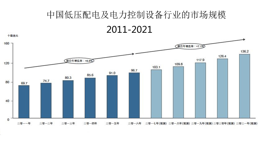 根據(jù)電氣行業(yè)市場(chǎng)調(diào)查報(bào)告,中國(guó)的低壓配電及電力控制設(shè)備市場(chǎng)于2011至2016期間取得快速增長(zhǎng),市場(chǎng)規(guī)模(按收益計(jì))由586億人民幣增至813億人民幣,2011至2016期間的復(fù)合年增長(zhǎng)率為6.8%。該市場(chǎng)主要由中國(guó)宏觀經(jīng)濟(jì)增長(zhǎng)、持續(xù)城市化、龐大基建建設(shè)投資及制造業(yè)快速發(fā)展帶動(dòng)。隨著相關(guān)政策及法規(guī)的實(shí)施,低壓配電及電力控制設(shè)備市場(chǎng)將更加標(biāo)準(zhǔn)化,并將繼續(xù)取得快速健康發(fā)展。